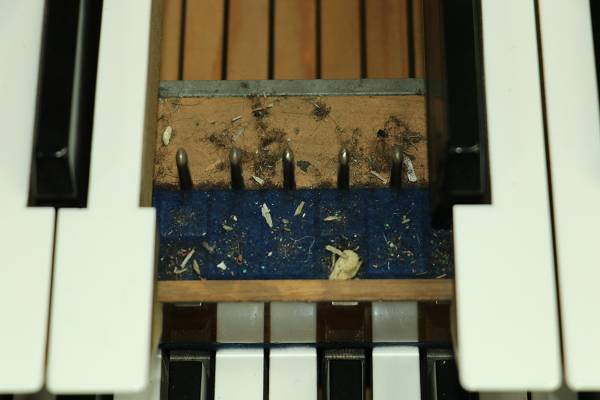 Unter den Klaviaturen hat sich eine Menge Staub angesammelt.