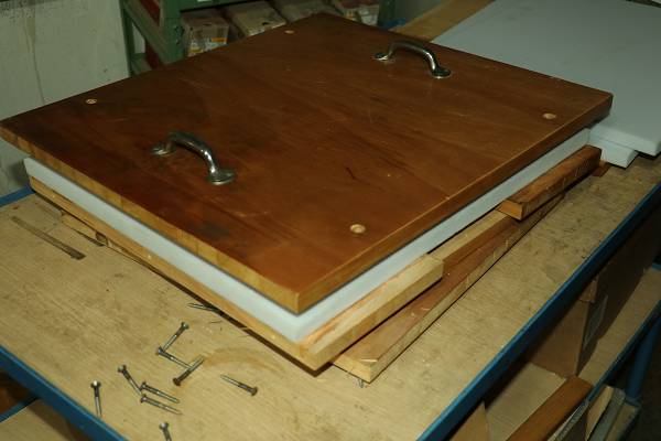 Eine Heizplatte für die Orgelspielenden wird in einen Rahmen eingebaut. Sie findet am Spieltisch ihren Platz.