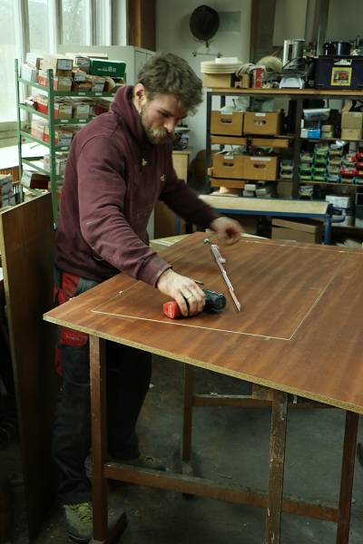 Späne: Der Zuschnitt für das neue Notenpult wird gemacht, damit das